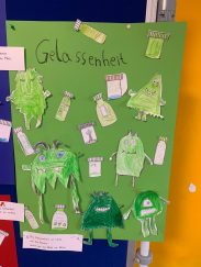 Da die Gefühle im Buch nachher in Gläsern geordnet sind, dürfen die Kinder auch Gefühlsgläser füllen. Manche schreiben Gefühle in eine Glas und ordnen sie den Farben zu. Andere malen Situationen oder Gegenstände.