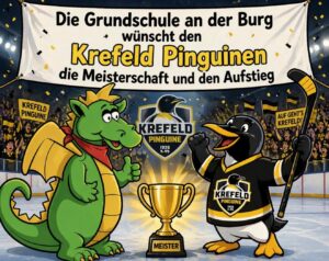 Der Eishockeyverein KEV aus Krefeld sorgt derzeit für große Begeisterung – nicht nur in der Stadt, sondern auch bei uns an der Grundschule. Im spannenden Aufstiegskampf fiebern viele Kinder mit ihrem Team mit und verfolgen die Spiele mit großer Leidenschaft.