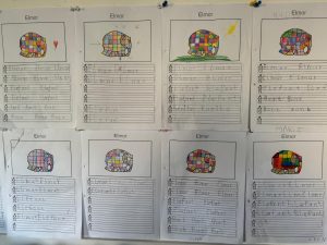 Dazu machten die Kinder viele Schreibübungen und bastelten kleine eigene Elmars. Von Beginn an lernen die Kinder, dass anders sein ganz normal ist und, dass jeder ganz individuell ist. Das ist kein Grund für Ausgrenzung oder Spott.