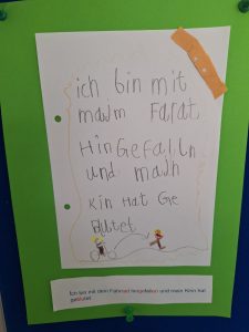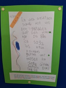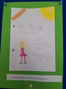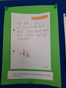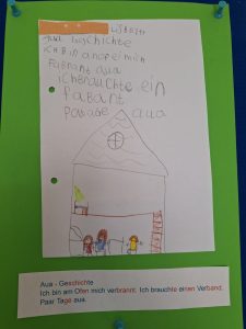 Dabei entstanden tolle Au-Geschichten. Wann hast du dich schon einmal verletzt? Was ist passiert? Was habt ihr dann gemacht? Konntest du schon mal jemandem helfen, der sich verletzt hat? Die Geschichten sind wirklich gelungen und mit Pflastern verziert worden.