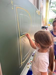 Nach einer Pause und einer kleinen Stärkung lernten die Kinder ihren ersten Buchstaben und machten erste Schreibversuche an der Tafel, in der Luft, auf dem Oberschenkel und später sogar schon auf einem Arbeitsblatt.