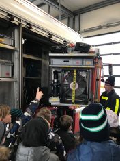 Dann durften wir in die Feuerwehrautos hereinklettern. Die sind so groß, dass auf der Rückbank sieben Personen Platz haben. Auch das ganze Zubehör, das für unterschiedliche Einsätze in den Autos ist, zeigte uns erklärte uns Manuel.