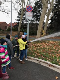 Die Jugendfeuerwehr muss das noch alles lernen und hat ein richtiges Klassenzimmer in der ersten Etage. Zum Schluss wurde ein Hydrant angeschlossen und wir durften als Höhepunkt mit einem Feuerwehrschlauch spritzen. Erst dachten einige Mädchen, dass dort nur ein paar Tropfen heraus kommen.