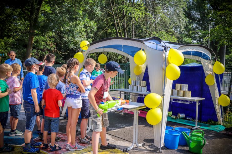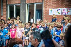 Bei strahlendem Sonnenschein und wunderschön gestalteten Spielständen der Klassen und der OGS hatten alle Kinder viel Spaß und es gab nur strahlende Gesichter. Zwei Mütter am Schminktisch leisteten vier Stunden Akkordarbeit. Als dann um 11 Uhr ein „Flash Mob“ startete waren auch die Eltern begeistert. Alle Kinder der Schule liefen, unser neues Schullied singend, zur Bühne.