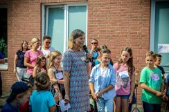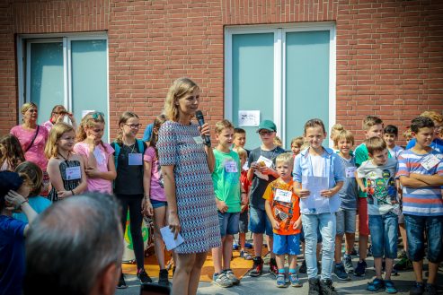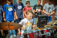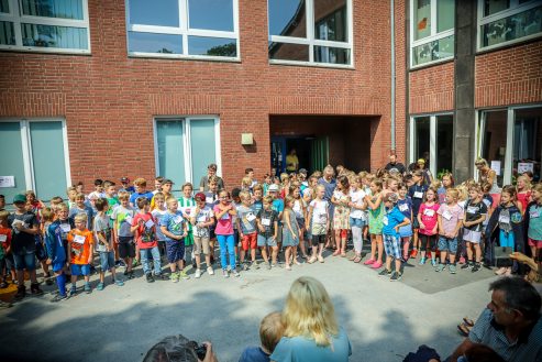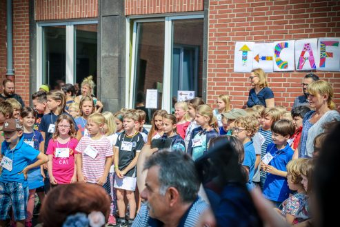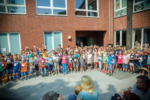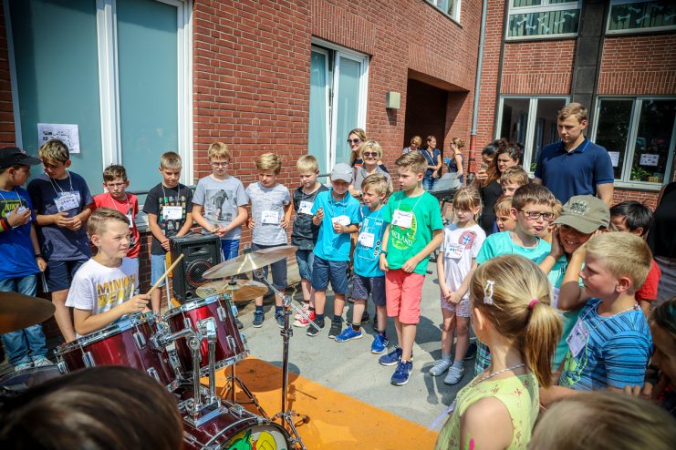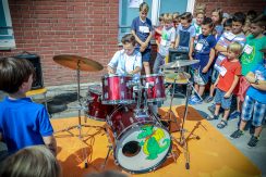 Das Schullied komponierte und textete unsere Kollegin Frau Jochim. Dann begrüßten der Schülersprecher Kilian und Frau Küsters alle Gäste und bedankten sich bei den Sponsoren. Zwei Kinder der Schule, Kilian und Jonathan, spielten jeweils ein Schlagzeugsolo. Spätestens bei „Highway to hell“ war es geschehen, alle Eltern, Lehrerinnen und Kinder sangen und tanzten mit. Unser Dank gilt Herrn Griethe von „Drummers Inspiration“, unserem musikalischen Kooperationspartner, der der Schule an diesem Tag ein Schlagzeug geschenkt hat.