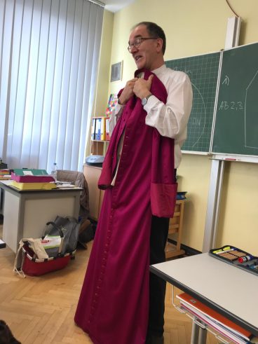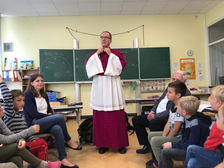Heute besuchte der Bischof gemeinsam mit dem Pfarrer Jansen unsere Schule. Sie kamen in die Klasse 3b und die Kinder hatten Gelegenheit, dem Bischof viele Fragen zu stellen. Das war toll! Zum Schluss präsentierte er der Klasse noch seine Insignien. Eine spannende Religionsstunde!