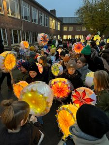 Die Kinder haben seit Wochen bereits an ihren Laternen gebastelt und die Lieder geprobt. Sonntag war es dann endlich soweit. Gegen 17 Uhr traf sich die Schulgemeinde auf dem Schulhof. Die Kinder bestaunten gegenseitig ihre Laternen und stellten sich klassenweise auf.