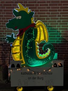 Ausgedacht und umgesetzt von Frau Gommans fuhr Burgo unser Schulmaskottchen vornweg. Hell beleuchtet und aus der Ferne schon zu sehen, wurde er auf einem Bollerwagen von vier Viertklässlern gezogen.