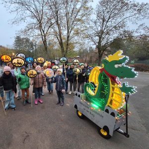 Ganz vorne fuhr unser neues Highlight: die Burgo-Schullaterne. Vielen Dank an den Förderverein, der diese Laterne möglich gemacht hat!