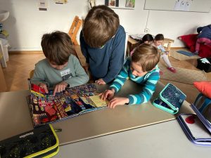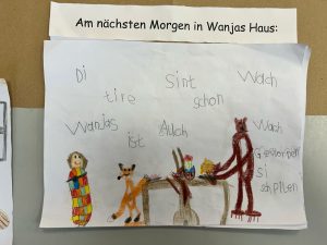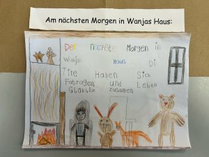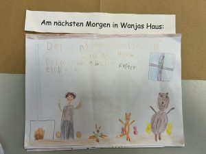 Die erste Klasse beschäftigte sich am Vorlesetag mit dem Buch „Es klopft bei Wanja in der Nacht“ von Tilde Michels. Die Kinder lauschten andächtig der Geschichte und malten dann dazu passende Bilder und schrieben erste Wörter und Sätze dazu.
