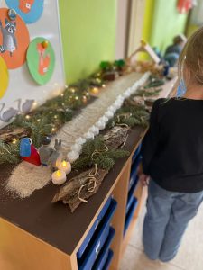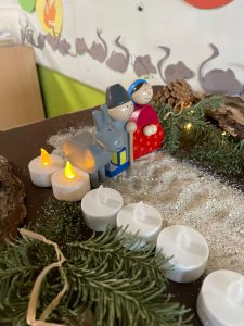 Maria und Josef haben sich nun auf den Weg gemacht . Jedes Kind darf in der Adventszeit ein Licht anmachen oder Maria und Josef weiter bis zum nächsten Licht stellen .