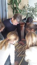 Als erstes haben wir das Gestell zusammengesteckt. Danach haben wir in Gruppen die Tasten, die gedeckten Pfeifen und die nicht gedeckten Pfeifen nach der Größe sortiert. Herr Kortmann hat dann die Windlade oben in das Gestell gesteckt und mit dem Blasebalg unten mit Rohren verbunden. Wir haben die Tasten geordnet in das Gestell gelegt und jede einzelne an einen Haken gehängt, der oben mit der Windlade verbunden war. Schließlich haben wir zuerst die gedeckten und danach die nicht gedeckten Pfeifen in die Windlade gesteckt.