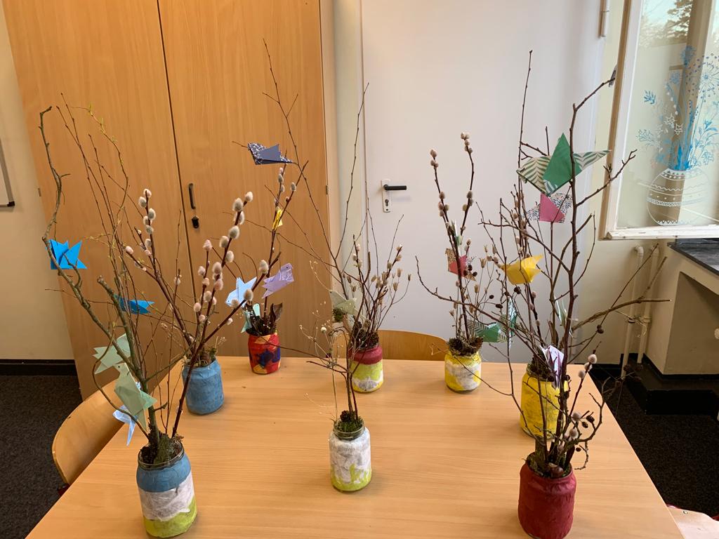 Die Drittklässler haben in der Kunst AG der OGS fleißig Naturmaterialien gesammelt , Gläser gestaltet und Vögel gefaltet.