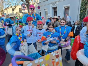 Die 4a verkleidete sich ganz nach dem Motto „Wir wollen unser Schwimmbad zurück“ als Schwimmbäder. Viele Kinder und Erwachsene trugen Pools, Schwimmreifen und allerlei anderen Badespaß mit sich. Passend zu den Schwimmbädern zogen viele der Klasse auch als Bademeisterinnen und Bademeister mit. Das Wetter kam für diese Kostüme wie gerufen!