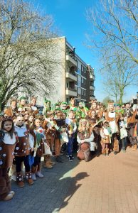 Die 3b ging ganz im Zeichen des Hülser Bergs. Frau Jochim als Robin Hood wurde begleitet von allerlei Waldtieren. Das große Highlight war ein selbstgebauter Schluff aus Bollerwagen.