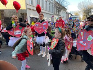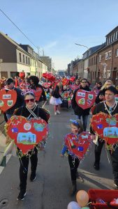 Die 3a nahm das diesjährige Zugmotto „Mein Herz schlägt Hölsch“ wörtlich. Die Kinder und Erwachsenen schmückten sich mit großen Herzen. Diese waren mit allerlei hölschen Traditionen und Hülser Besonderheiten, wie Sehenswürdigkeiten, schönen Plätzen, Sportvereinen usw. verziert. Auch Isi und Franz die Klassentiere zogen mit.