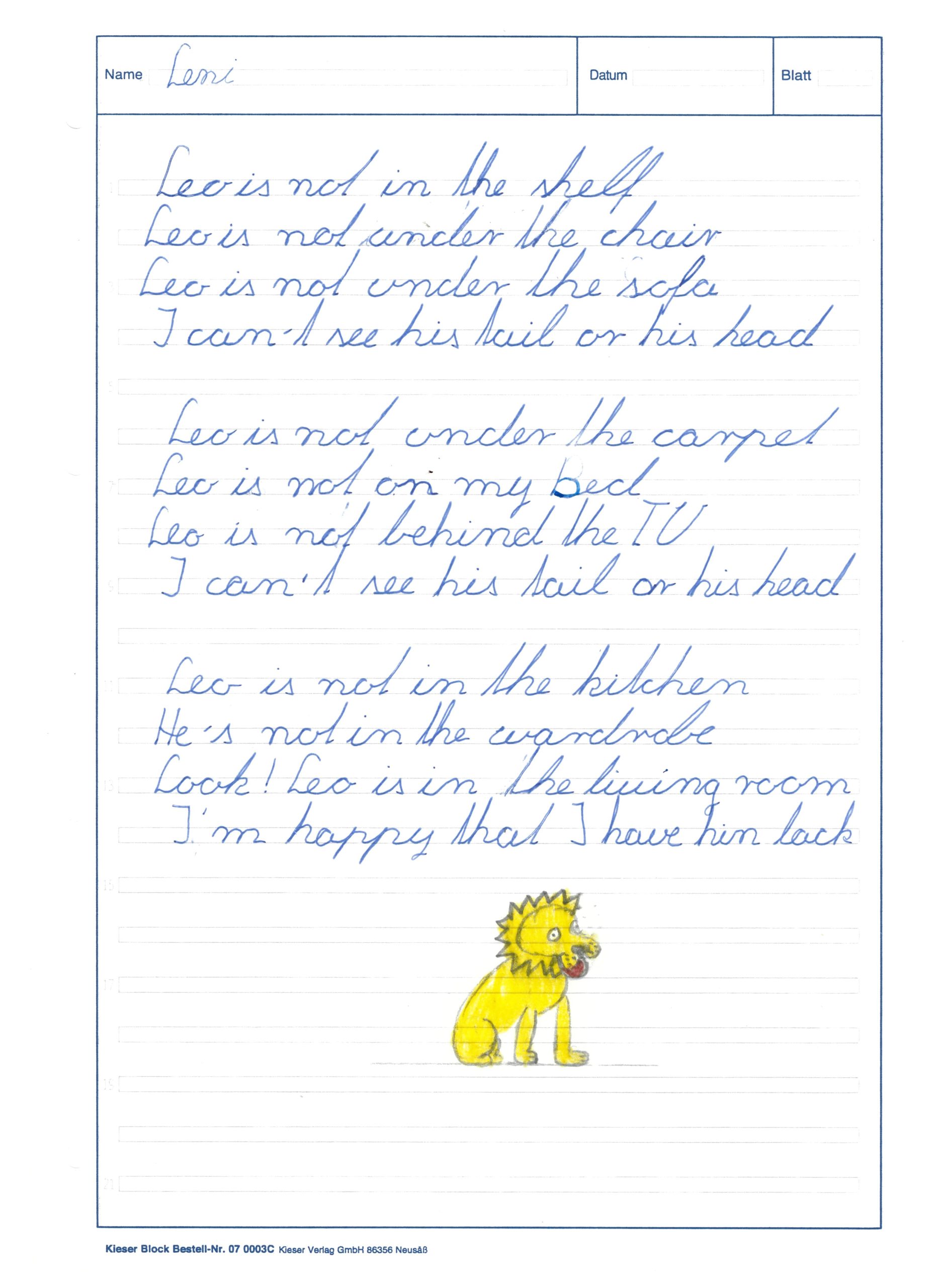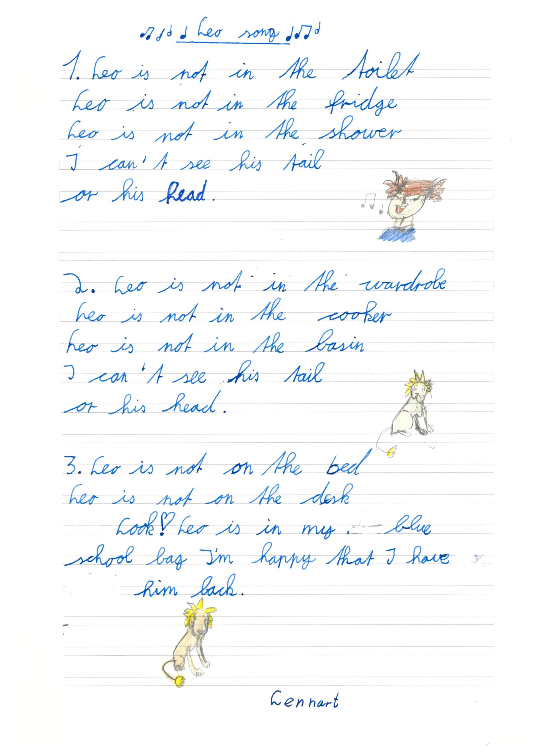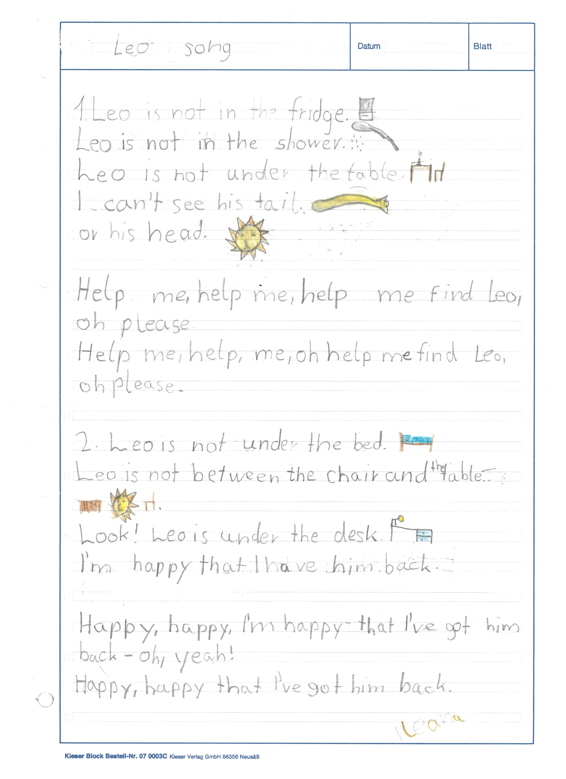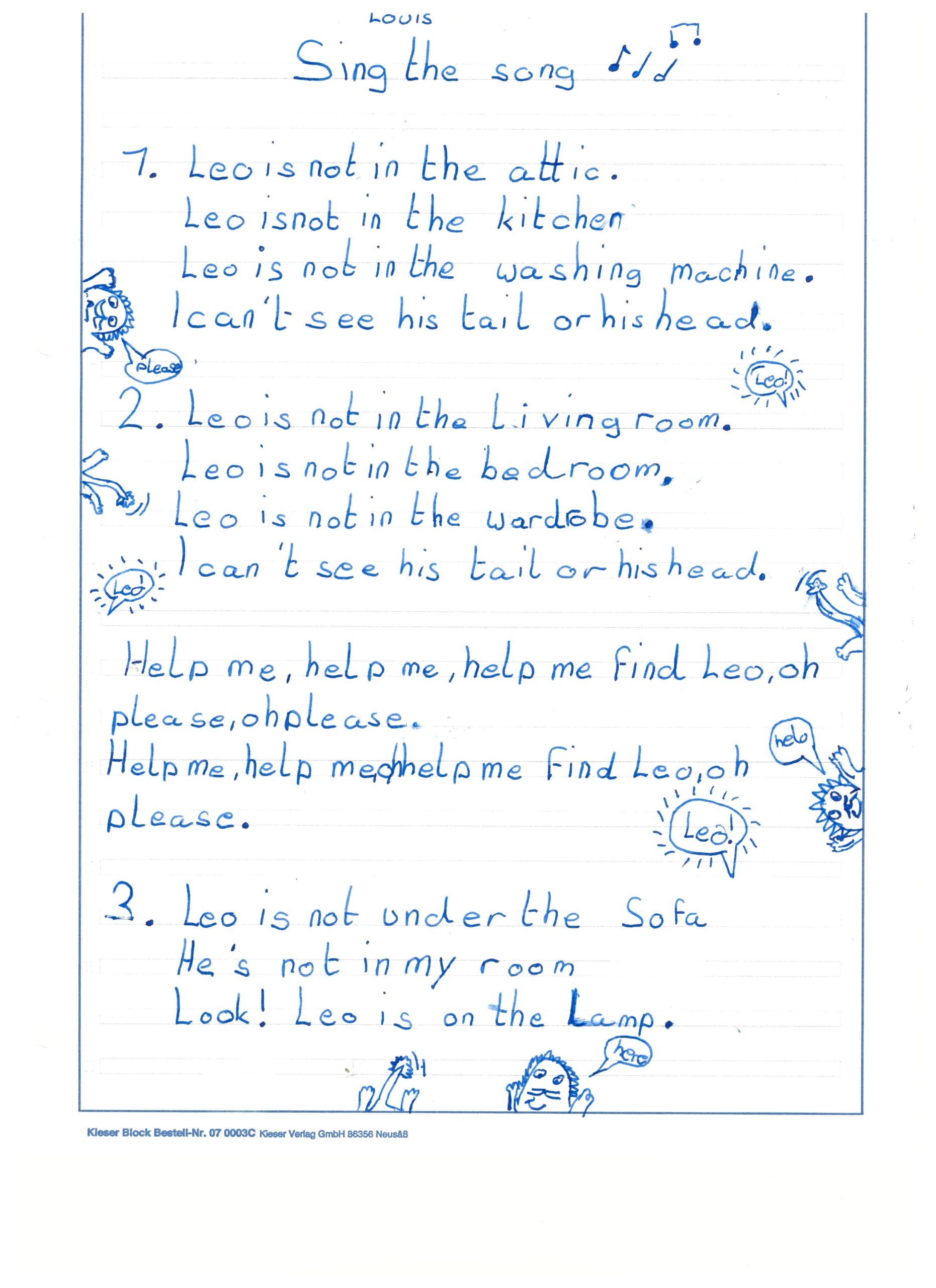Im Rahmen der aktuellen Unterrichtsreihe im Englischunterricht zum Thema „At Home“ wurden die Kinder der 3a und 3b aufgefordert mit Hilfe dreier Beispielstrophen eines Liedes zu unserem Maskottchen „Leo“, selber kreativ zu werden und eigene Strophen in der Zielsprache zu verfassen. Die Ergebnisse können sich wirklich sehen lassen!
