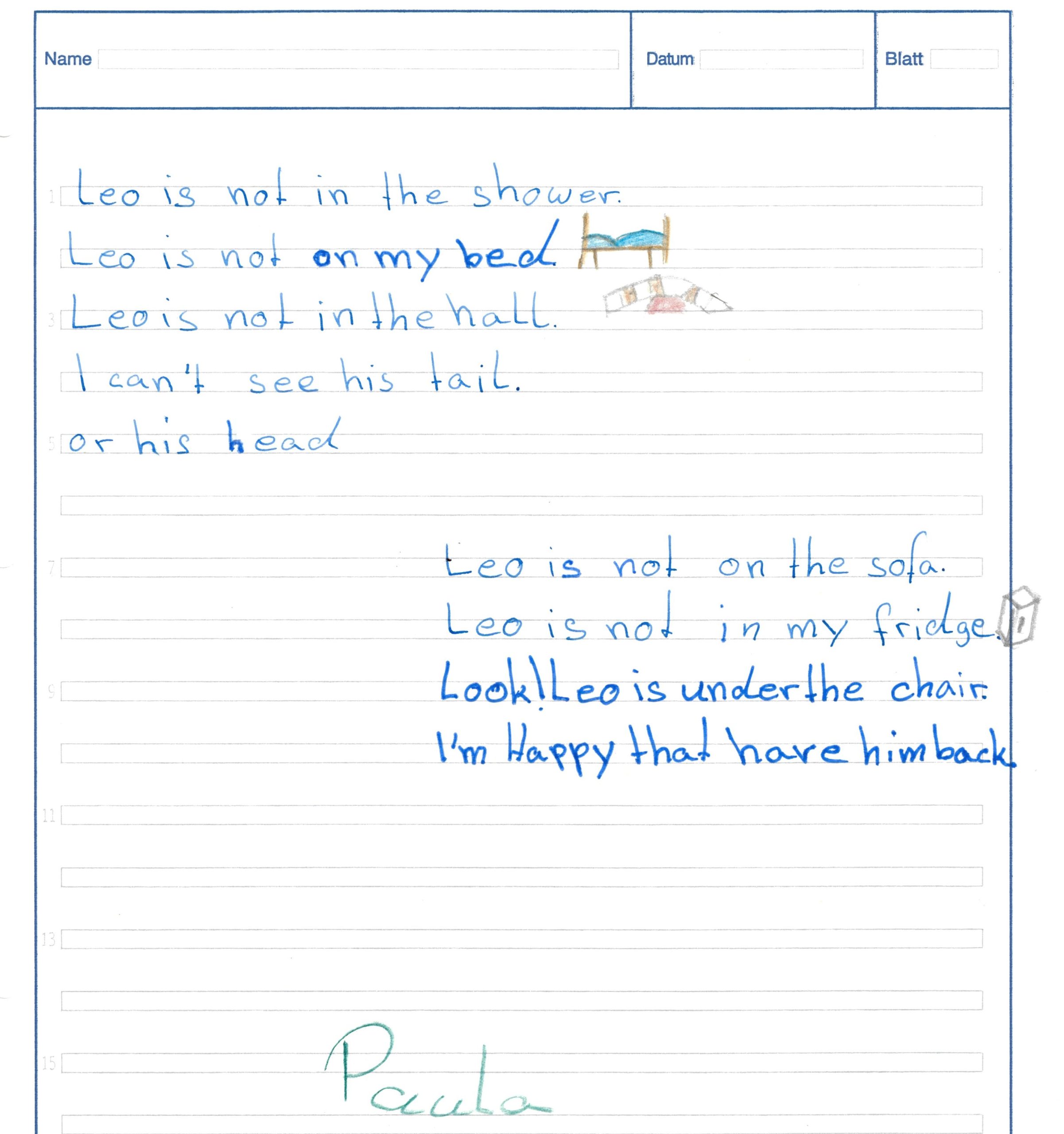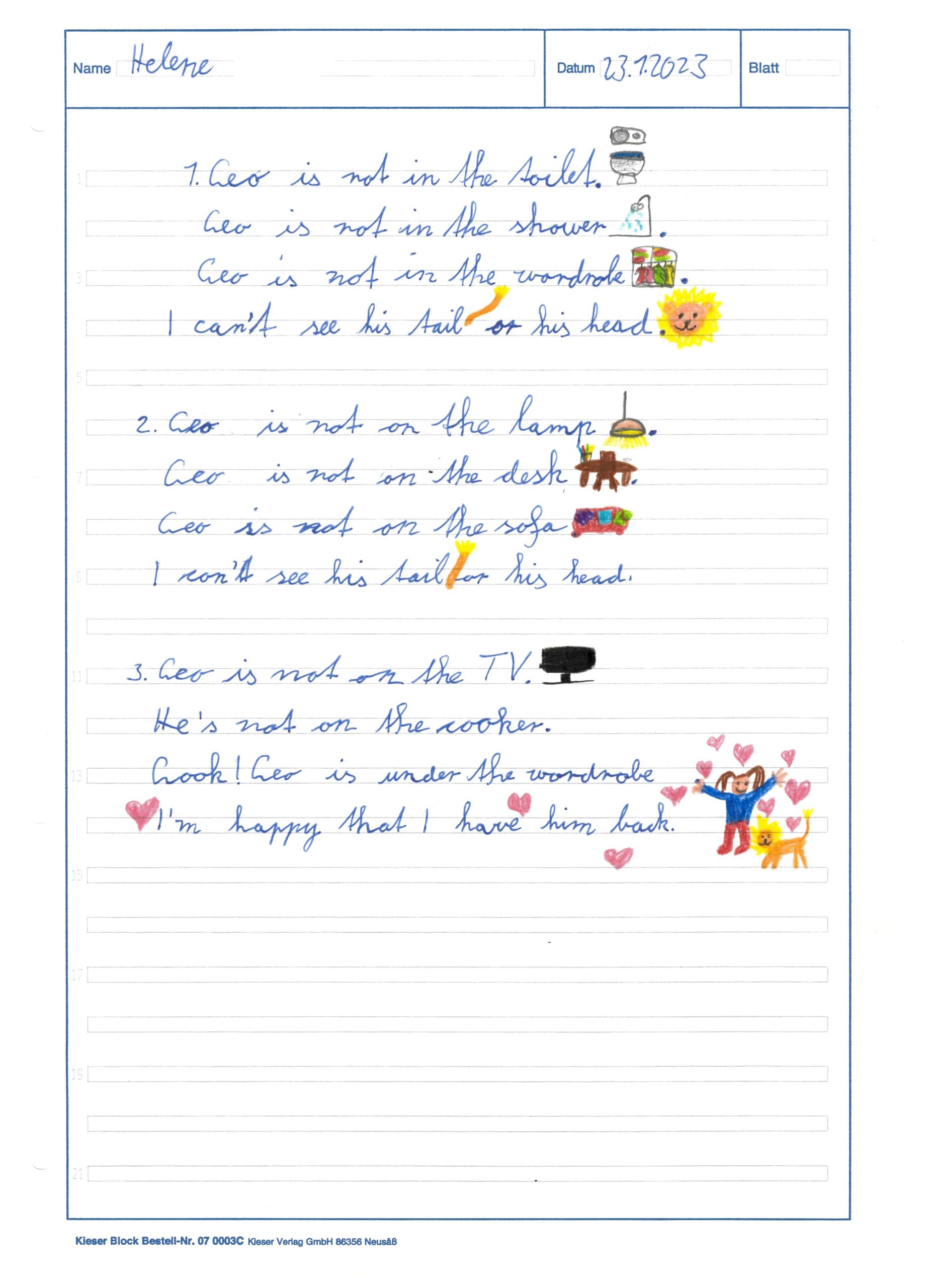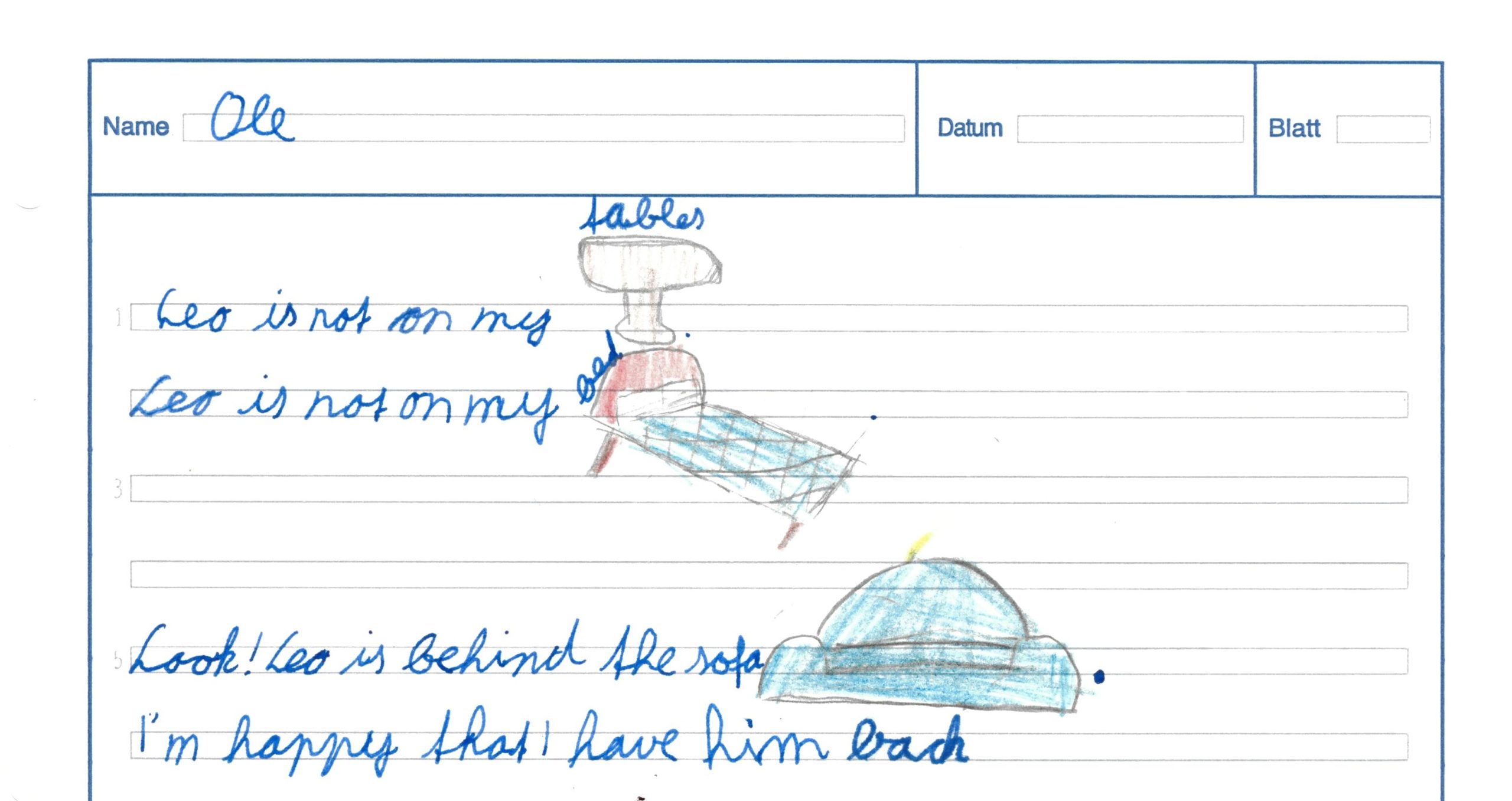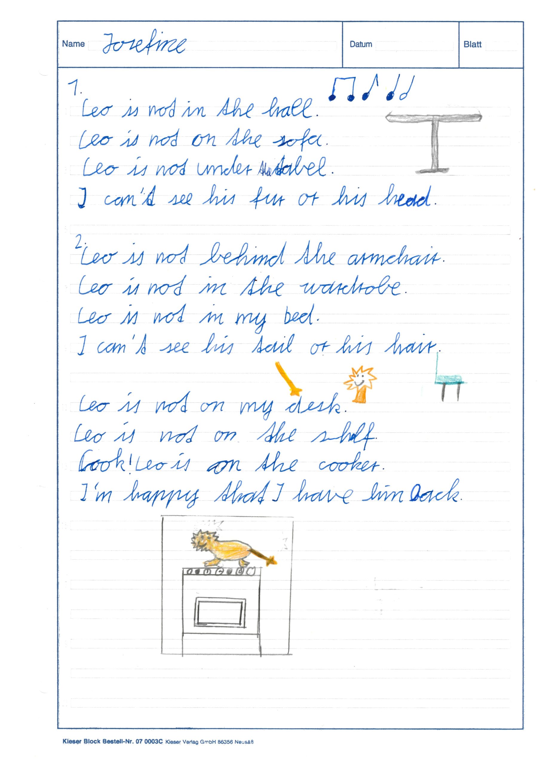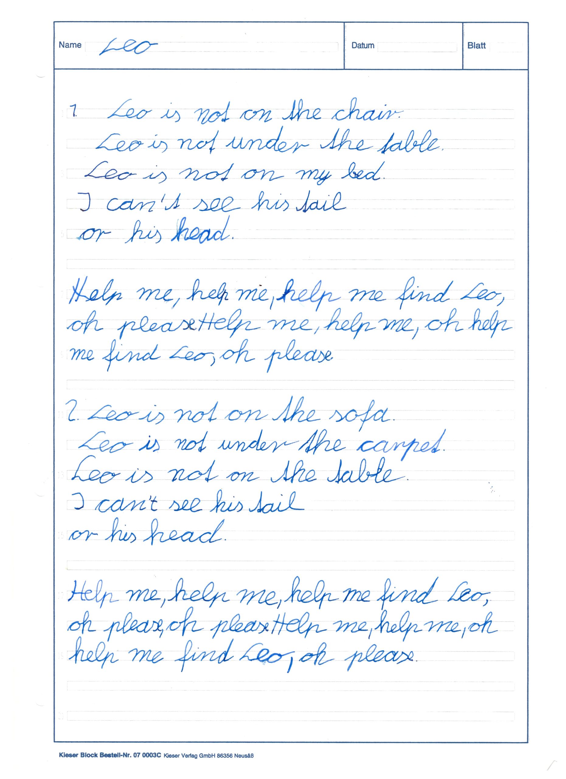 Im Rahmen der aktuellen Unterrichtsreihe im Englischunterricht zum Thema „At Home“ wurden die Kinder der 3a und 3b aufgefordert mit Hilfe dreier Beispielstrophen eines Liedes zu unserem Maskottchen „Leo“, selber kreativ zu werden und eigene Strophen in der Zielsprache zu verfassen. Die Ergebnisse können sich wirklich sehen lassen!