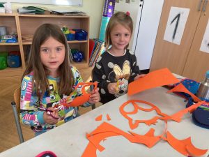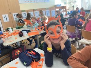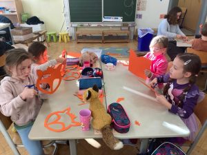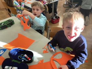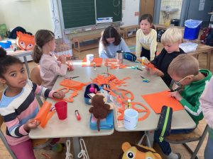 Die Erstklässler bereiten voller Freude ihre Klassentierlaternen vor. Mit Unterstützung einiger ehemaliger Schülerinnen und Schüler werden die Pappen zurecht geschnitten und geprickelt und mit Transparentpapier hinter klebt.