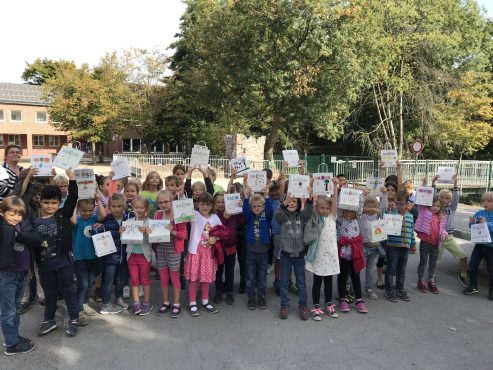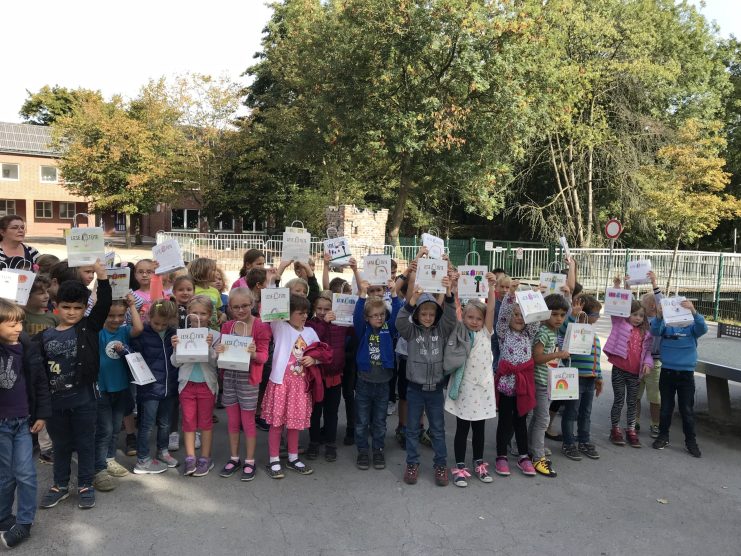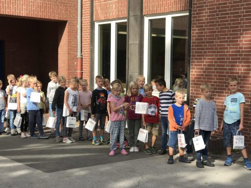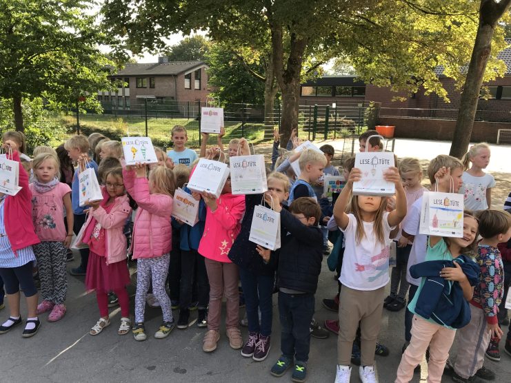 Heute überreichten unsere zweiten Klassen den Erstklässlern die wunderschönen Buchtüten der Hülser Buchhandlung. So werden wir schon frühzeitig zum Lesen verlockt.