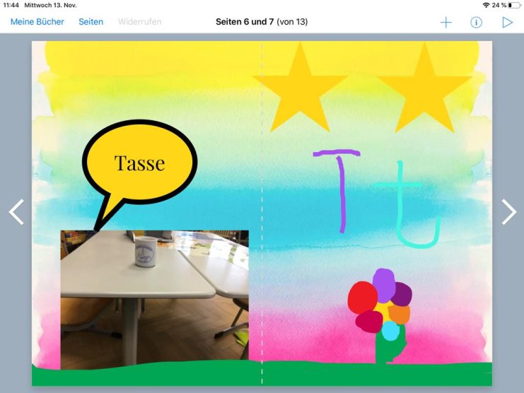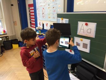 Hoch motiviert fotografierten sie Gegenstände passend zu ihrem Buchstaben, erstellten akustische Aufnahmen, fügten Texte ein oder malten eigene Bilder auf den Ipads . Mit Hilfe der verschiedenen Optionen des Programms konnten sie diese dann kreativ verändern, bearbeiten und mit Hintergründen unterlegen.