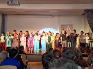 Am Montag und Dienstag dieser Woche haben Chor- und Theater-AG unter der Leitung von Frau Jochim und Frau Caris das Musical „Die Königin von Saba“ erfolgreich aufgeführt. In allen drei Vorstellungen konnten sich die Mitwirkenden über ein volles Haus freuen. Der Besuch der Königin von Saba bei König Salomo war zauberhaft mit schönen Kostümen und sogar einer Gruppe von bunten Tänzerinnen inszeniert. Die existentiellen Fragen der Königin konnte Salomo durchaus beantworten. Das Publikum verlangte mit seiner Begeisterung nach zwei Zugaben. Ein großartiges Erlebnis für Jung und Alt!