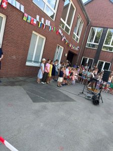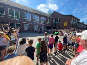 Zum Ende der Projektwoche „Rund um die Welt“ hat die Gruppe von Frau Jochim ihre einstudierten Lieder und verschiedene Tänze aus aller Welt zur Aufführung gebracht und damit die Projektpräsentation für die Eltern auf dem Schulhof eröffnet. Zu Beginn sangen die Kinder einen Begrüßungskanon in verschiedenen Sprachen, es folgten Lieder auf französisch, englisch und deutsch. Auch ein afrikanisches Klatschspiel war dabei. Darauf folgte ein Indianertanz und ein Begrüßungstanz aus Ghana, ein brasilianisches Lied mit einem tanzenden Kanarienvogel, ein hebräischer Tanz und zu guter Letzt ein Tanz mit verschiedenen Schritten aus Rumänien. Die Kinder hatten sehr viel Spaß bei der Einstudierung und konnten auch das Publikum mit ihrer Freude an der Musik anstecken.