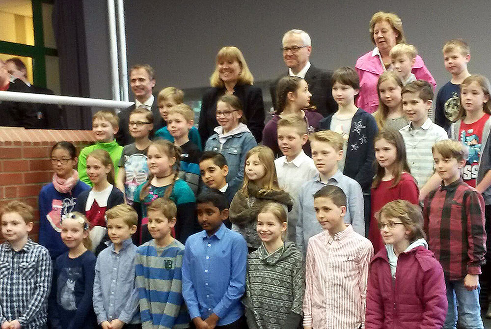 Unsere Schüler Lennart F. aus der 4a und Lucas H. aus der 4c – hier auf einem Gruppenfoto mit Frau Koblenz-Lüschow (Schulamtsdirektorin) und Herrn Micus (Dezernent) – bei der Siegerehrung der 32 besten Teilnehmer am Mathewettbewerb (Regionalrunde). Maria-Sibylla-Merian Gymnasium.
