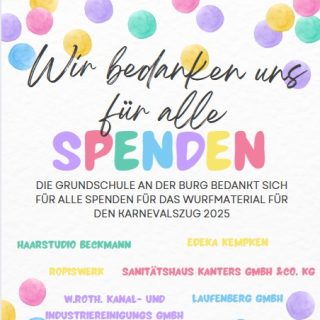 Wir möchten uns für alle Spenden für Wurfmaterial für den Karnevalszug bedanken. Viele Firmen haben Sach- und Geldspenden für uns gesammelt. Über die erwähnten Firmen hinaus, haben noch einige Eltern Spenden privat oder aus...