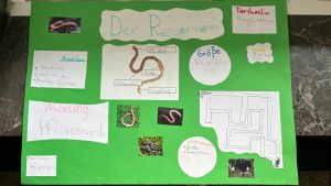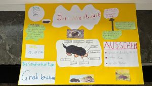 Das große Projekt der Reihe war bzw. ist das Erstellen eines eigenen Lernplakates. Zunächst mussten die Kinder mit Hilfe eines kurzen Sachtextes einen kleinen Steckbrief zu ihrem Wiesentier ausfüllen. Dieser diente dann als Vorlage für das Lernplakat.