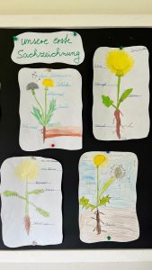 In der nächsten Doppelstunde wurden Löwenzähne und Pusteblumen gesucht und genau unter die Lupe genommen, um im Anschluss eine erste eigene Sachzeichnung anzufertigen.