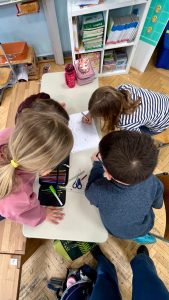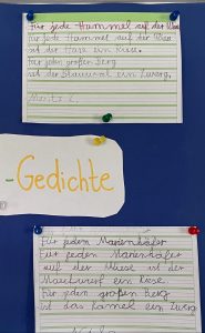 Mit großer Freude wurde die Rätsel- und Gedichteseite im Lesebuch zunächst gemeinsam gelesen, um dann mit Feuereifer eigene kleine Rätsel und Gedichte zu schreiben.