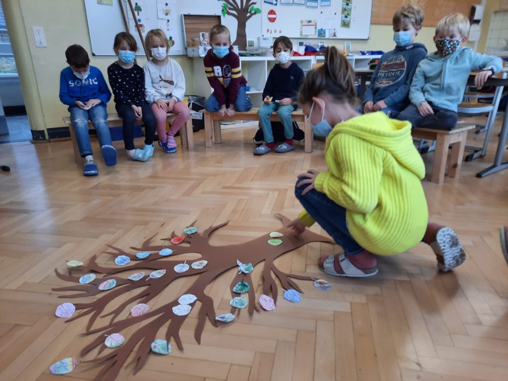 Die ersten Klassen haben das Buch „Der Buchstabenbaum“ gelesen. Alle Kinder haben – wie auch im Buch – aus einzelnen Buchstaben viele Wörter gemacht. Ihre Lieblingswörter haben sie an den großen Buchstabenbaum geheftet. Anschließend haben sie selbst aus Zeitung und Pappe Buchstabenbäume gestaltet.