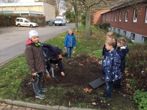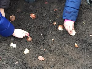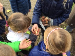 Am letzten Freitag kamen die Kinder unserer Patenklasse zu uns, um mit uns Blumenzwiebeln zu pflanzen. Gemeinsam gingen die Schüler der 3a mit uns vor das Schulgebäude. Dort lockerte Frau Hitschler die Erde, damit wir die Zwiebeln in die Erde setzen konnten. Die großen Kinder zeigten uns, worauf man achten muss. Nun sind wir gespannt, wann wir im Frühling die ersten grünen Spitzen sehen können.
