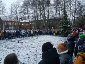 Pünktlich zum ersten Advent traf sich die ganze Schule am Montagmorgen unterm großen Tannenbaum auf dem Burggelände. Heute mit einer ganz besonderen Zugabe: Es hatte in der Nacht geschneit und der Schnee war glücklicherweise liegen geblieben. Alle Kinder sangen bekannte Weihnachtslieder wie „Wir sagen euch an den lieben Advent“, „Dicke rote Kerze“ oder „Lasst uns froh und munter sein“. Anschließend gingen die Kinder zurück in die Klassen und die (unechten) Kerzen auf den Adventskränzen wurden entzündet und die ersten Kapitel der Weihnachtsbücher gelesen. Die magische Zeit beginnt mit einem tollen Schneetag!