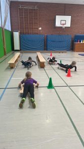 Passend zur wunderschönen Winterlandschaft in Hüls hat die 1a sich diese in die Turnhalle gezaubert. Es gab Stationen zum Eisklettern und Eishockeyspiel, zum Bobfahren und Rodeln, aber auch Kunststücke aus dem Eiskunstlauf sowie eine Schnellballschlacht konnten erprobt werden.