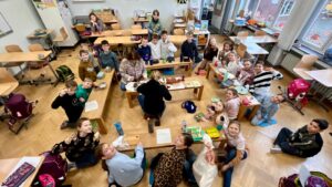 Die Kinder hören St. Martinslieder, lauschten der Geschichten und schmierten und belegten ihren Weckmannteil nach Belieben.